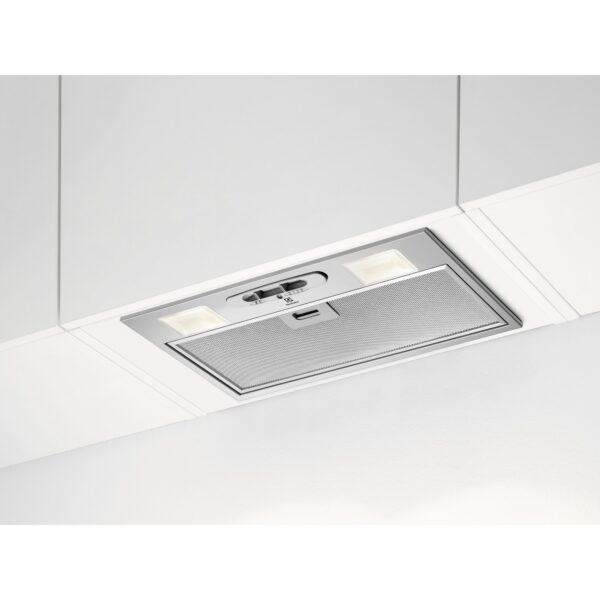 The Electrolux LFG335S is a 52 cm built-in (integrated) cooker hood from the 300 LedLights series, designed to be installed within kitchen cabinets. It features a stainless steel (Inox) finish and provides both extraction and recirculation options.